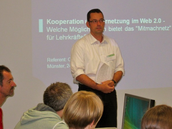 Mein Workshop „Kooperation und Vernetzung von Lehrkräften im Web 2.0“ beschäftigte sich mit der Frage, wie mit den neuen Kommunikationsformen im Internet der Erfahrungsaustausch und die Vernetzung von Lehrkräften unterstützt werden können. Zahlreiche Internetangebote wurden dazu erkundet und erste Gehversuche in einem Wiki gemacht. Am Ende waren sich die rund 25 Teilnehmer des Workshops einig: Social Networks, Wikis, Blogs, Facebook & Co. eröffnen für Schule und Unterricht völlig neue Möglichkeiten der Zusammenarbeit. Die schier unüberschaubare Fülle an Informations- und Kommunikationsangeboten im Netz erschwert Einsteigern allerdings den Zugang. Nach ihren Wünschen bzw. Bedarfen gefragt, kamen sehr konkrete Rückmeldungen von den Teilnehmern:
