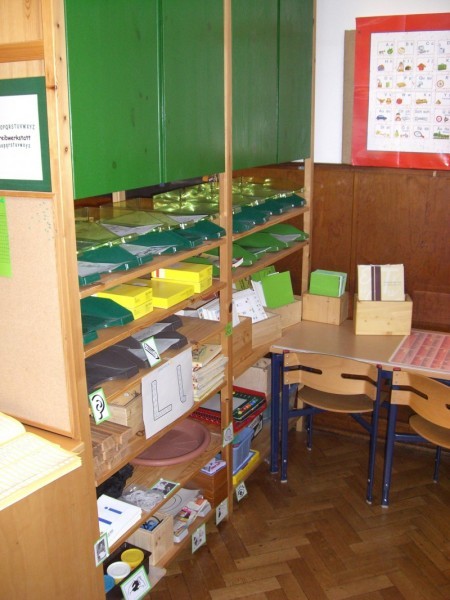 - Die Materialordnung: In den Regalen und Schränken im hinteren Teil des Klassenraums sind in farblicher und thematischer Struktur alle didaktischen Materialien für alle Lernniveaus greifbar. Zusätzlich finden sich überall an den Wänden in durchdachter Struktur (Wiedererkennung durch Farben und Symbole) Übersichten und Hilfsmittel für die Kinder. Außerdem gibt es einfache aber wirkungsvolle Helfer, wie z.B. die Ohrschützer, die für konzentriertes Arbeiten in den Freiarbeitsphasen, in denen es schon mal geräuschvoller zugehen kann, zur Verfügung stehen.
