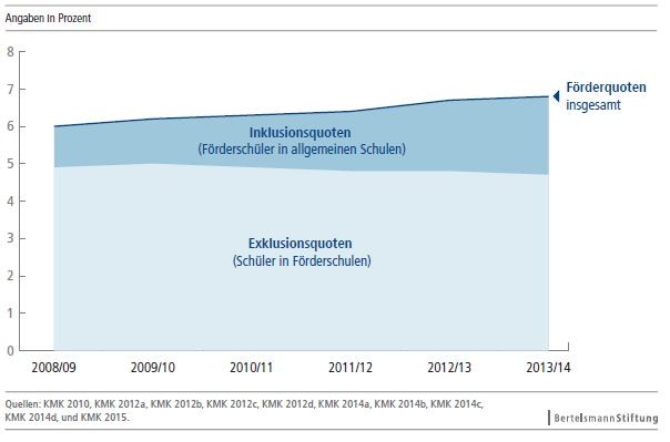 Blogbeitrag_Inklusion_1Zwar steigen die Inklusionsanteile seit Jahren – zugleich sinkt allerdings der Anteil der Schüler, die Förderschulen besuchen nur leicht. Dies zeigt die Exklusionsquote, die bundesweit im Schuljahr 2008/09 bei 4,9 Prozent lag und derzeit nur um 0,2 Prozentpunkte auf 4,7 Prozent zurückgegangen ist. Vor Inkrafttreten der UN-Behindertenkonvention war die Exklusionsquote sogar niedriger (2001/02: 4,6 Prozent) als heute. Das liest sich paradox, ist allerdings erklärbar, wenn man sich eine weitere statistische Zahl anschaut: Bundesweit wird bei immer mehr Kindern ein sonderpädagogischer Förderbedarf festgestellt. Zwischen den Schuljahren 2008/09 und 2013/14 ist die sogenannte Förderquote von 6,0 auf 6,8 Prozent gewachsen.