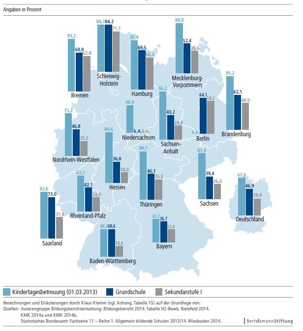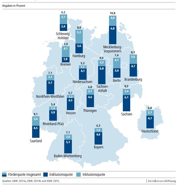 Blogbeitrag_Inklusion_3Von bundesweit vergleichbaren Chancen auf Teilhabe an Inklusion kann noch keine Rede sein. Unterschiedliche Förderpolitiken in den Bundesländern erschweren den Weg zum gemeinsamen Lernen und verhindern vergleichbare Chancen für alle Förderschüler in Deutschland. Während in den Stadtstaaten wie Bremen (Inklusionsanteil: 68,5 Prozent), Hamburg (59,1 Prozent) und Berlin (54,5 Prozent) oder in Schleswig-Holstein (60,5 Prozent) die Mehrheit der Förderschüler an Regelschulen lernt, sind es in Hessen (21,5 Prozent) und Niedersachsen (23,3 Prozent) weniger als ein Viertel. Auch der Anteil der Schüler, die separiert an Förderschulen unterrichtet werden, unterscheidet sich erheblich. Die Spannweite liegt hier zwischen Exklusionsquoten von 6,8 Prozent in Mecklenburg-Vorpommern oder Sachsen-Anhalt bis zu 1,9 Prozent in Bremen. Nicht zuletzt weichen die Förderquoten in Folge unterschiedlicher Diagnosestandards auf Landesebene stark voneinander ab. Die höchste Förderquote in Mecklenburg-Vorpommern ist mit 10,8 Prozent doppelt so hoch wie in Niedersachsen (5,3 Prozent) oder Rheinland-Pfalz (5,4 Prozent). Bei den Abschlüssen der Schüler an Förderschulen sind bundesweit ebenfalls große Unterschiede erkennbar. Während in Thüringen 54,7 Prozent dieser Schüler die Förderschulen ohne Hauptschulabschluss verlassen, sind es in Brandenburg 86,2 Prozent.