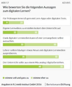 Die gute Nachricht: auch in der Berufsausbildung, egal ob im Betrieb oder in der Schule, ist das Thema digitales Lernen grundsätzlich angekommen. Allerdings mit deutlich skeptischer Haltung. Das gilt zum Beispiel für viele Berufsschullehrer und Ausbilder. Viel offener sind die meisten Azubis. Die sind in der Regel interessiert und wünschen sich das auch von ihren Lehrern.