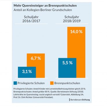 Weil Quereinsteiger typischerweise über weniger pädagogisch-psychologisches Wissen verfügen als ihre grundständig ausgebildeten Kollegen, sind sie auf besondere Unterstützung in der Vorbereitung und Gestaltung von Lehr- und Lernprozessen angewiesen. Wie werden sie aber in Schulen und Kollegien integriert? Dieser Frage ging eine Studie der Bertelsmann Stiftung aus dem Jahr 2018 mit Blick auf die öffentlichen Grundschulen in Berlin nach. Neben dem Quereinsteigeranteil im Kollegium haben wir darin insbesondere untersucht, ob Quereinsteiger verstärkt an Schulen in herausfordernder Lage, sog. Brennpunktschulen, eingesetzt werden. Unsere Untersuchung basierte ursprünglich auf Daten der Berliner Schulstatistik für die Schuljahre 2016/17 und 2017/18. Da inzwischen auch Daten für das darauffolgende Schuljahr vorliegen, konnten wir die bestehende Analyse jetzt fortschreiben.
