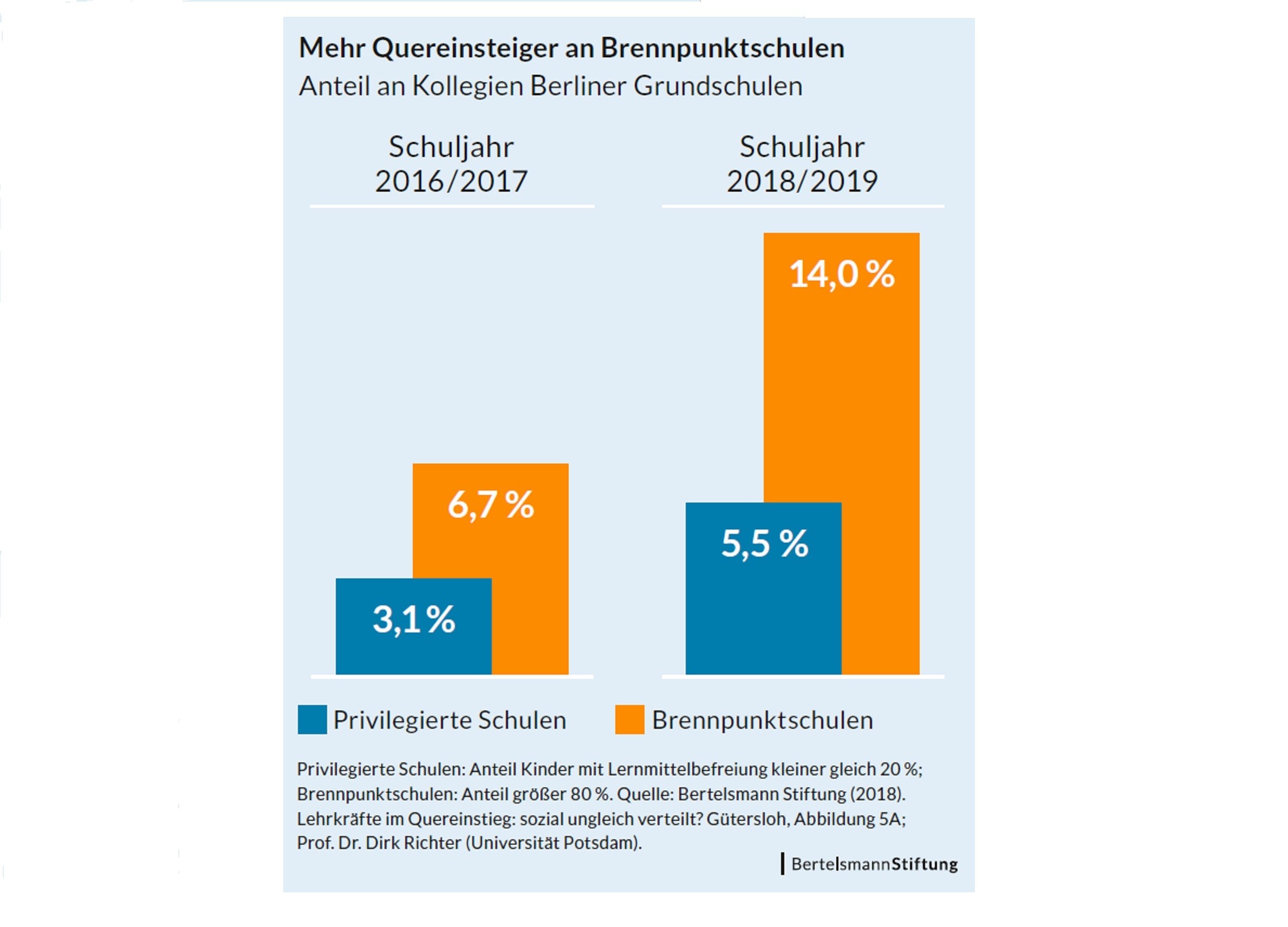 Weil Quereinsteiger typischerweise über weniger pädagogisch-psychologisches Wissen verfügen als ihre grundständig ausgebildeten Kollegen, sind sie auf besondere Unterstützung in der Vorbereitung und Gestaltung von Lehr- und Lernprozessen angewiesen. Wie werden sie aber in Schulen und Kollegien integriert? Dieser Frage ging eine Studie der Bertelsmann Stiftung aus dem Jahr 2018 mit Blick auf die öffentlichen Grundschulen in Berlin nach. Neben dem Quereinsteigeranteil im Kollegium haben wir darin insbesondere untersucht, ob Quereinsteiger verstärkt an Schulen in herausfordernder Lage, sog. Brennpunktschulen, eingesetzt werden. Unsere Untersuchung basierte ursprünglich auf Daten der Berliner Schulstatistik für die Schuljahre 2016/17 und 2017/18. Da inzwischen auch Daten für das darauffolgende Schuljahr vorliegen, konnten wir die bestehende Analyse jetzt fortschreiben.