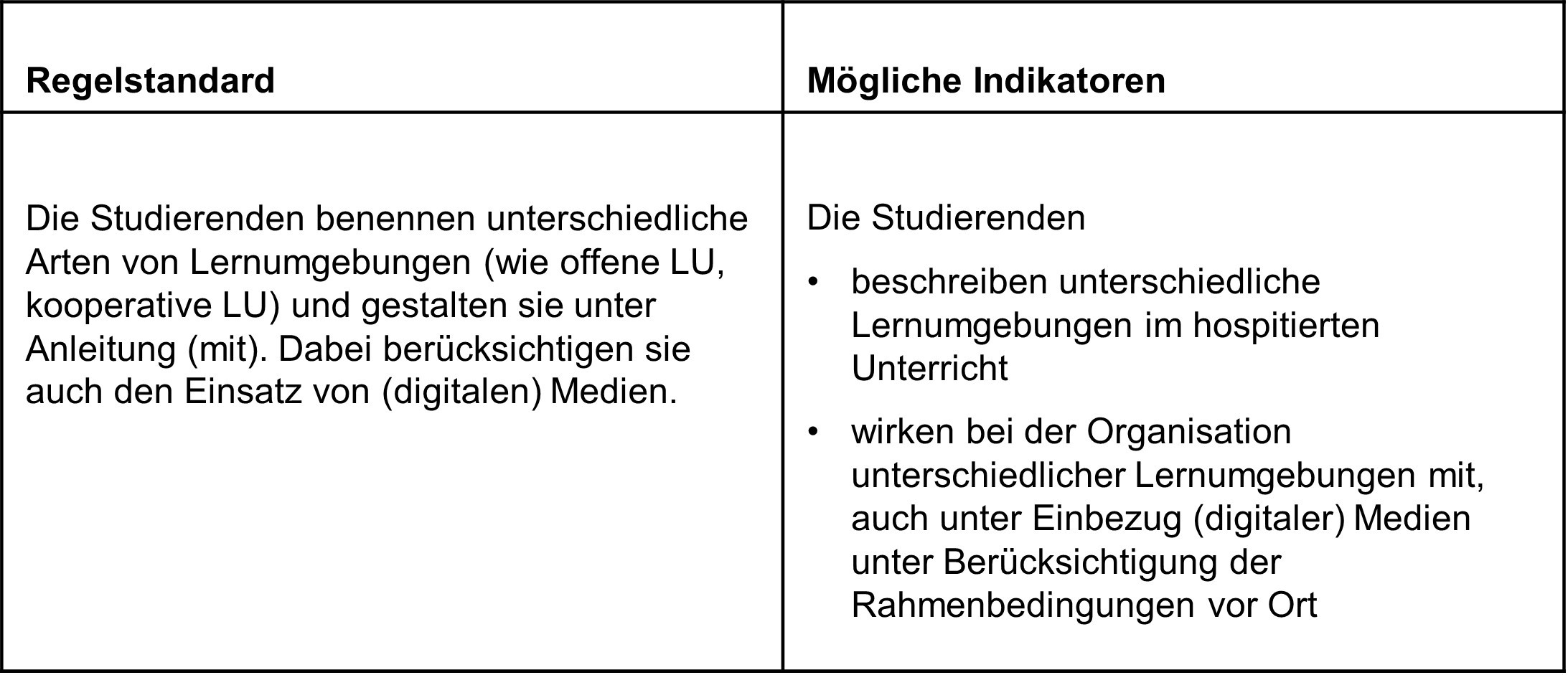 In der Arbeit der Gruppe wurde dann ein Kompetenzstandard für die fertige Lehrkraft definiert und von dort aus „rückwärts“ gedacht: In welcher Ausprägung kann eine solche Kompetenz bei Referendarinnen und Referendaren angelegt werden, was würden Vertreterinnen und Vertreter der II. Phase – beispielsweise Seminarlehrkräfte – hier voraussetzen? Was ist in der universitären Phase zu erwarten und inwiefern spielen fachdidaktische Modelle bereits im ersten Praktikum eine Rolle, wenn noch nicht davon ausgegangen werden kann, dass die Studierenden hier bereits entsprechende Veranstaltungen belegt haben. Und schließlich natürlich die Frage, wie sich solche Kompetenzen sichtbar manifestieren. Um auf unser vorheriges Beispiel zurückzukommen, finden sich für die Dimension „Gestaltung von Lernumgebungen (LU)“ im Praktikum nun zwei Standardformulierungen mit beispielhaften Indikatoren: