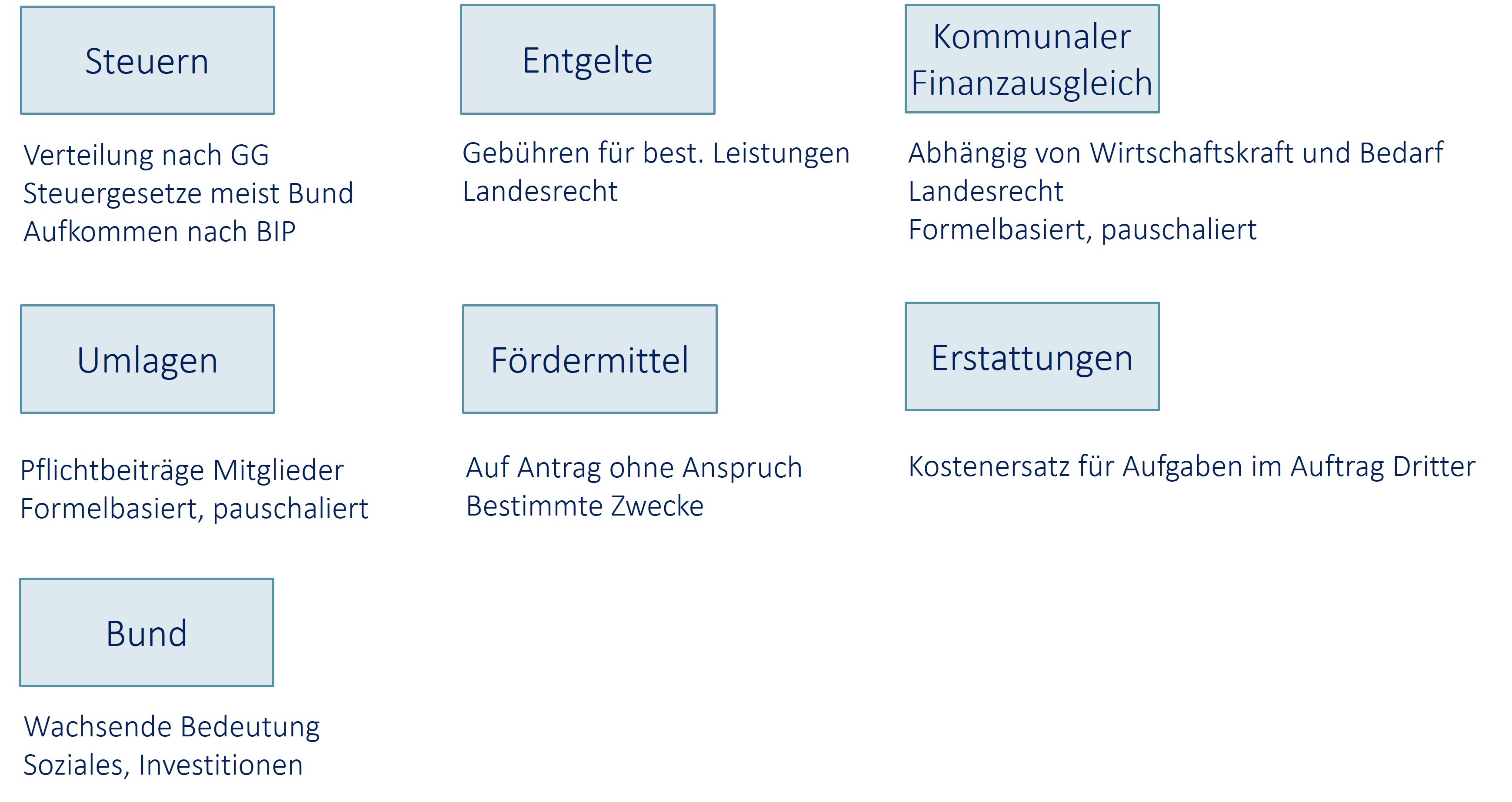 Städte und Gemeinden finanzieren sich im bundesweiten Durchschnitt zu rund 50 Prozent aus Steuern und 20 Prozent aus unterschiedlichen Zuweisungen des Landes. Weitere kommunale Einnahmen stammen unter anderem aus Gebühren, beispielsweise für die Abfallentsorgung, Kita-Elternbeiträge, Gebühren für den Erwerb eines Bibliotheksausweis oder Friedhofsgebühren. Diese Gebühren sind zweckgebunden und dürfen nur die Kosten der betreffenden Leistung decken.