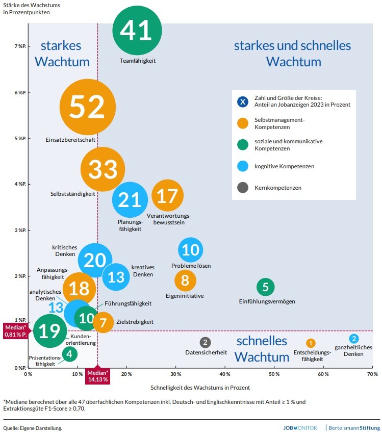 In einer immer komplexer werdenden Welt spielen Future Skills eine entscheidende Rolle, um Veränderungen aktiv zu gestalten. Der Arbeitsmarkt hat das erkannt und fordert von zukünftigen Mitarbeiter:innen immer mehr Zukunftskompetenzen wie Anpassungsfähigkeit, kritisches Denken und Einfühlungsvermögen. Das ist auch für Jugendliche relevant, die sich bereits in der Schule beruflich orientieren oder sich im Übergang zwischen Schule und Beruf befinden. Welcher Beruf passt zum eigenen Kompetenzprofil, zu den persönlichen Stärken und Interessen und wo ermöglicht die Berufswelt jungen Menschen die Aus- und Weiterbildung wichtiger Zukunftskompetenzen? Stellenanzeigen können relevante Hinweise auf Kompetenzen geben, die auf dem Arbeitsmarkt nachgefragt werden. Die Studie „Kompetenzen für morgen“ der Bertelsmann Stiftung hat vor diesem Hintergrund rund 47 Millionen Online-Stellenanzeigen des Jobmonitors ausgewertet. In diesem Blogbeitrag stellen wir die wichtigsten Ergebnisse kompakt vor. Im Fokus der Analyse standen zwei Fragen: